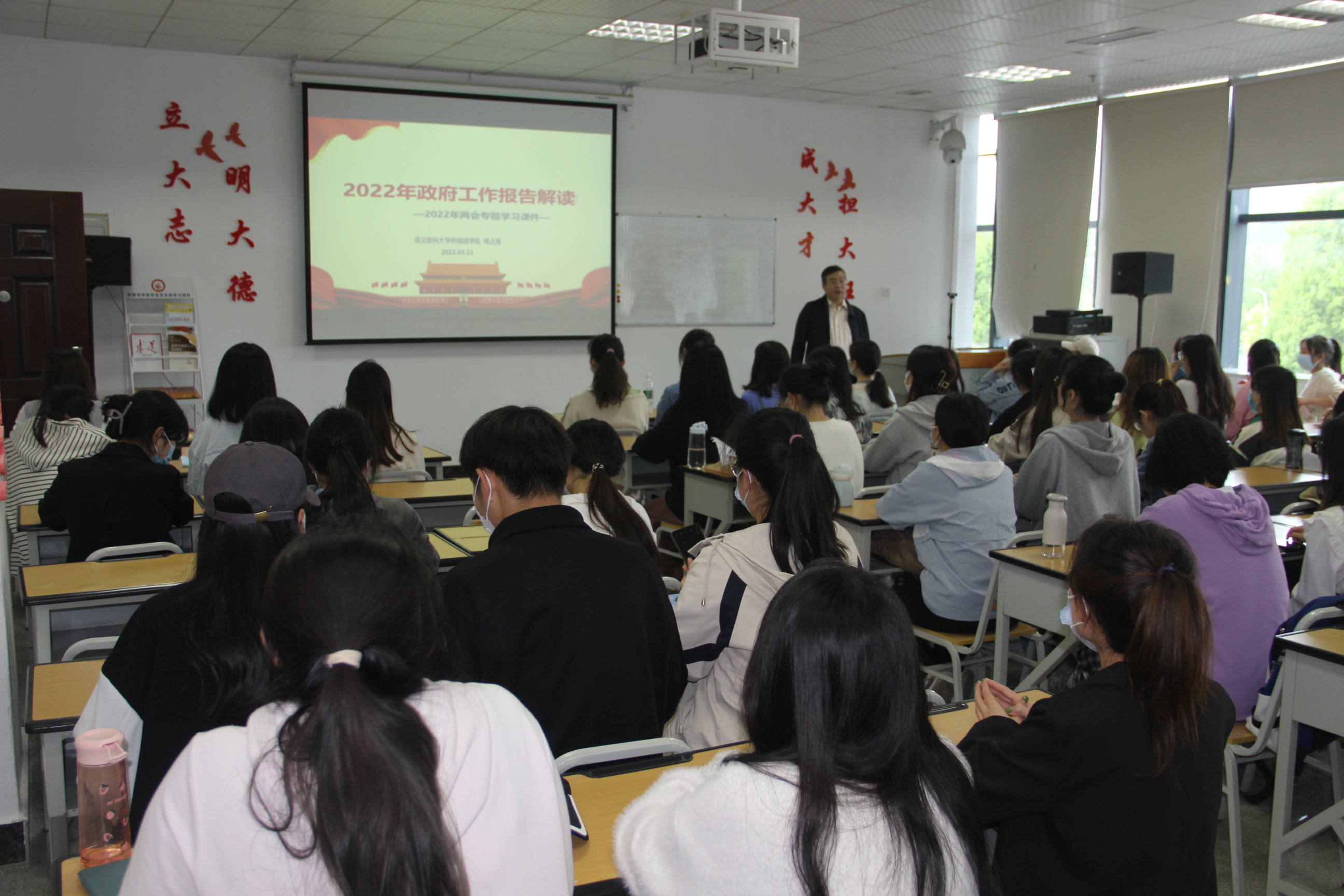 中国的发展之路从来都不是一帆风顺的,更没有一马平川的。2022年4月21日15:30,威廉williamhill体育在二楼党员活动室举办了题为《2022年政府工作报告解读》的思政课。2020级全体同学参会,党委书记谭占海主讲。