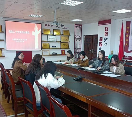 党支部书记何永娇分享了党的二十大报告中“为党育人、为国育才,培育德智体美劳全面发展的社会主义建设者和接班人”的育人要求,提出作为一名教师,她更加感到沉甸甸的使命和责任,一定要用实际行动践行“为党育人,为国育才”的使命担当。