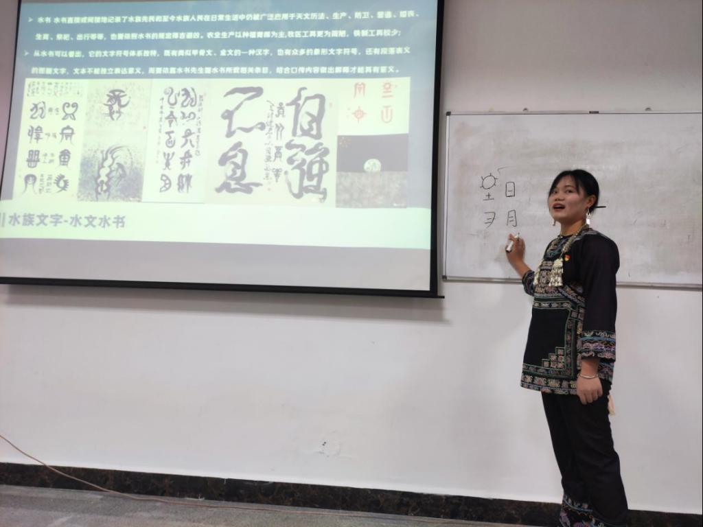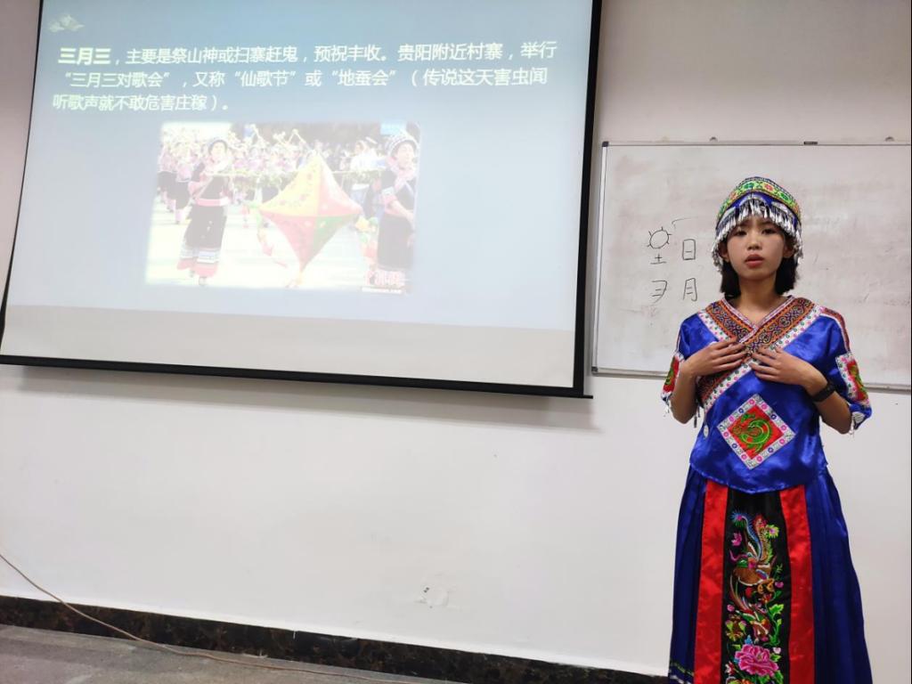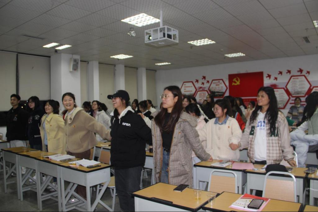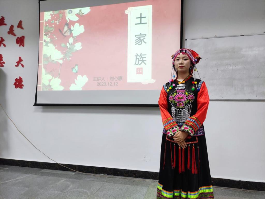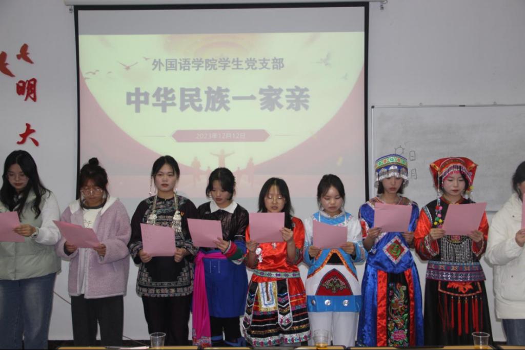 以“初心不灭、青春不悔”为题,中共预备党员王枷娇分享了第一书记黄文秀的先进事迹,给大家讲了一堂生动的党课。她鼓励大家积极从榜样身上汲取力量,承担起党员干部的责任,砥砺前行,谱写新时代的青春乐章。支部少数民族同志穿上自己民族的服饰,通过PPT、视频、现场表演、诗歌朗诵等形式,沉浸式展示了水族、苗族、侗族、土家族、布依族、白族的民族文化,学说少数民族语言、学唱少数民族歌曲、学跳少数民族舞蹈、学习少数民族习俗、了解少数民族服饰、品尝少数民族特产等。最后,大家一起朗诵了《中华民族一家亲》。在场成员积极、主动参与其中,像石榴籽一样紧紧拥抱,让民族团结的种子根植于每个人心中。