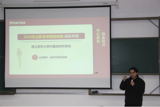 吴沈川针对公司员工的公职考试意向,围绕2024年国家公务员考试招录简章解读,选岗建议及报考指导,笔试面试阶段备考规划,银行、省考、事业单位、国企等招考简介及备考计划,贵州省定向选调生招考简介及备考计划五个方面进行详细地讲解。吴沈川深入分析了招录人数比,帮助同学了解目标岗位以及相应的岗位竞争情况,并耐心回答了同学们的提问,指导同学们有针对性地选岗。吴沈川还为在场同学提供丰富的线上公考网课资源。他提醒同学们要认真对待公职类考试,明确自己的目标,认真科学备考,找到合适自己的备考方法,提前做好考试准备。