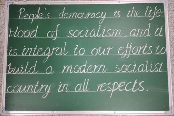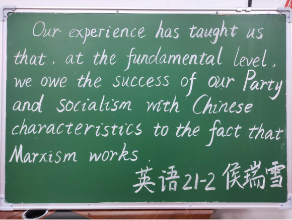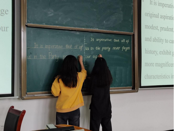 成功的教学离不开出色的板书,一手美观、正确、规范的板书能激发学习热情。训练营对字体笔法、板书结构、板书内容、板书逻辑、书写速度等方面都有严格要求。第一堂课讲授了26个英文字母的书写;第二堂课是训练单词书写,专门挑选了社会主义核心价值观24个英文单词、党的二十大热词英文词组作为训练内容;第三堂课是练习党的二十大金句英文段落。课堂训练时,好学的同学们总是虚心向老师提问请教,大家进步明显,锤炼才得以蜕变。课后,员工助理会收集意见反馈,及时掌握训练的实际情况,根据员工们的吸收情况调整授课内容和方式。为检验同学们的学习成果,员工党支部还组织了“粉笔凝实力 书写展精神”的英文粉笔字板书比赛。