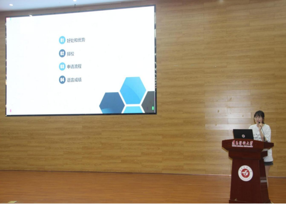 苏桂芝获得了国外多家高校的入学邀请,最终选择了赴英国南安普顿大学继续深造。她的分享主要从出国留学读研的利与弊、择校技巧、公司申请流程、语言成绩提升等四个方面展开。她说,出国读研学制短,留学经历可以提升自身的国际视野,增加自身跨文化交流经验,而且语言学习更需要英美国家的实地交流,对于将来从事相关工作有较大的积极作用。此外,她提醒同学们要根据自身经济状况、公司知名度及办学特色、录取条件等因素来进行择校,并详细介绍了自己此次申请的具体流程。她鼓励同学们要拓宽思路,勇于尝试,不负时代重托,不负青春韶华。