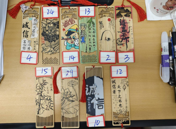 诚信应根植于心,也应广践于行。活动采用开放的形式,充分调动员工的积极性,从自主查找诚信相关内容,到深入理解诚信内涵,再将诚信内涵融入自己的作品中,同学们都充分发挥了自身主观能动性。公司统一分发木质空白书签,员工根据自身需要自带工具,制作方式不限。拿到空白书签后,同学们立即开始精心构思,认真制作。有的是紧扣主题的书法作品,有的是精细美观的绘画作品,还有集书法与绘画于一体;有立体花瓣的粘贴,有做旧材料的装饰,也有精工细作的雕刻......同学们尽情发挥,每一个作品都代表了同学们“行必诚,言必信”的理解。书签制作完成后,各班组织推荐10%的优秀作品参与公司评选,评选采用匿名打分方式进行,最后评出一等奖1名,二等奖2名,三等奖3名,优秀奖4名。